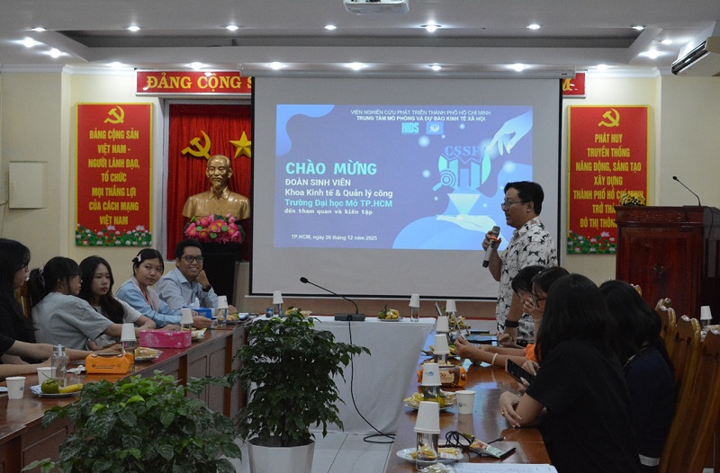 Ngày 26 tháng 12 năm 2025 trong khuôn khổ môn học Chính phủ điện tử, tập thể hơn 50 sinh viên lớp DH23PM01 – Khoa Kinh tế và Quản lý công, Trường Đại học Mở TP. Hồ Chí Minh đã có chuyến tham quan ý nghĩa tại Trung tâm Mô phỏng và Dự báo Kinh tế – Xã hội (CSSF) thuộc Viện Nghiên cứu phát triển TP.HCM (HIDS). Đây không chỉ là một buổi tham quan đơn thuần, mà là dịp để sinh viên ngành quản lý công tìm hiểu những ứng dụng của dữ liệu và công nghệ hiện đại đến quản lý nhà nước trong bối cảnh chuyển đổi số và thực hiện chính quyền địa phương 2 cấp.